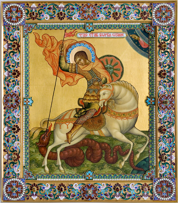 One of the most well known icons in Russia is that of Saint George, the patron saint of Moscow, slaying a dragon. The popular story is about a dragon that inhabited a lake in Libya. He was evil but worshipped by pagans who sacrificed their children to appease him. When the daughter of Queen Elisiba was to be sacrificed it was with great sadness. George, armed and on his white horse came to the rescue of the princess and said “In the name of the Father, the Son, and the Holy Spirit,” before striking the dragon. The horse trampled the dragon and George had the princess bind the dragon with her belt. Then they brought the dragon to the town where George killed him in front of everyone. Saint George saved the townspeople from a dragon that represented Satan so they converted to Christianity. The icon is a symbol of conversion to the Christian faith.