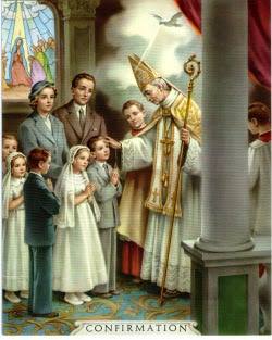 In the Catholic Church Confirmation is a rite of passage in which a young adult confirms his or her faith in God and membership in the Catholic Church. Confirmation is a way for those who have been baptized to affirm what their parents had done for them as an infant. Prior to Confirmation, students are required to take classes to prepare them for this journey. Confirmation is conducted by a bishop with a group of candidates during a special mass. During this mass candidates are presented by someone who has helped prepare them for their confirmation. After a sermon the candidates will renew their baptismal promises and then be anointed with oil in the shape of a cross on their forehead. After the mass ends there is usually a reception in which Certificates of Confirmation are presented.